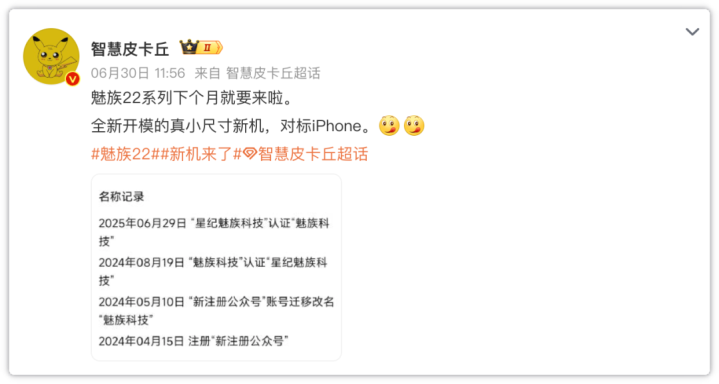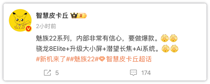 7月13日,知名博主智慧皮卡丘发帖称:“魅族22系列,内部非常有信心,要做爆款。骁龙8至尊版芯片+升级大小屏+潜望长焦+Ai系统。”